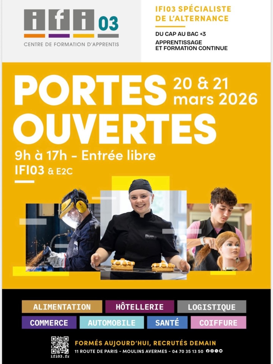 Samedi 21 mars 2026, de 9 h à 17 h, l’IFI 03 – Institut de Formations Interprofessionnel, situé à Moulins-Avermes, invite le public à découvrir son campus et ses formations lors de sa deuxième journée de portes-ouvertes.